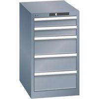 Dielenské zásuvkové skrine Lista, 3 alebo 5 zásuviek. Zámok na kľúč. Optimálne využitie vďaka plnému výsuvu a optimálnej výške čela zásuviek. Vynikajúca ochrana proti prachu, kvapalinám a mechanickému opotrebovaniu vďaka uzavretému rámu s povrchom odolným proti nárazom a oderu. Systém proti prevráteniu, ktorý zabraňuje pádu zásuvky, a individuálne zamykanie zásuviek. Ochrana proti korózii elektroforetickým imerzným lakovaním a striekaním. Optimalizované úložné priestory a organizácie vďaka deliacemu materiálu LISTA prispôsobenému každému použitiu a zásuvkám vybaveným drážkami a perforáciami. Profesionálne popisovanie s popisovacím softvérom LISTA Script a výklopnou úchytkou na vkladanie štítkov. Dokonale tichý pohyb vďaka sane bez priečnika. Deliaci materiál do zásuviek nie je súčasťou dodávky. Nutné dokúpiť zvlášť. Max. zaťaženie (kg) : 75 kg