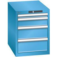 Dielenské zásuvkové skrine Lista, 4 zásuvky. Zámok na kľúč. Optimálne využitie vďaka plnému výsuvu a optimálnej výške čela zásuviek. Vynikajúca ochrana proti prachu, kvapalinám a mechanickému opotrebovaniu vďaka uzavretému rámu s povrchom odolným proti nárazom a oderu. Systém proti prevráteniu, ktorý zabraňuje pádu zásuvky, a individuálne zamykanie zásuviek. Ochrana proti korózii elektroforetickým imerzným lakovaním a striekaním. Optimalizované úložné priestory a organizácie vďaka deliacemu materiálu LISTA prispôsobenému každému použitiu a zásuvkám vybaveným drážkami a perforáciami. Profesionálne popisovanie s popisovacím softvérom LISTA Script a výklopnou úchytkou na vkladanie štítkov. Dokonale tichý pohyb vďaka sane bez priečnika. Deliaci materiál do zásuviek nie je súčasťou dodávky. Nutné dokúpiť zvlášť. Max. zaťaženie (kg) : 75 kg