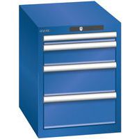 Dielenské zásuvkové skrine Lista, 4 zásuvky. Zámok na kľúč. Optimálne využitie vďaka plnému výsuvu a optimálnej výške čela zásuviek. Vynikajúca ochrana proti prachu, kvapalinám a mechanickému opotrebovaniu vďaka uzavretému rámu s povrchom odolným proti nárazom a oderu. Systém proti prevráteniu, ktorý zabraňuje pádu zásuvky, a individuálne zamykanie zásuviek. Ochrana proti korózii elektroforetickým imerzným lakovaním a striekaním. Optimalizované úložné priestory a organizácie vďaka deliacemu materiálu LISTA prispôsobenému každému použitiu a zásuvkám vybaveným drážkami a perforáciami. Profesionálne popisovanie s popisovacím softvérom LISTA Script a výklopnou úchytkou na vkladanie štítkov. Dokonale tichý pohyb vďaka sane bez priečnika. Deliaci materiál do zásuviek nie je súčasťou dodávky. Nutné dokúpiť zvlášť. Max. zaťaženie (kg) : 75 kg