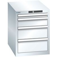 Dielenské zásuvkové skrine Lista, 4 zásuvky. Zámok na kľúč. Optimálne využitie vďaka plnému výsuvu a optimálnej výške čela zásuviek. Vynikajúca ochrana proti prachu, kvapalinám a mechanickému opotrebovaniu vďaka uzavretému rámu s povrchom odolným proti nárazom a oderu. Systém proti prevráteniu, ktorý zabraňuje pádu zásuvky, a individuálne zamykanie zásuviek. Ochrana proti korózii elektroforetickým imerzným lakovaním a striekaním. Optimalizované úložné priestory a organizácie vďaka deliacemu materiálu LISTA prispôsobenému každému použitiu a zásuvkám vybaveným drážkami a perforáciami. Profesionálne popisovanie s popisovacím softvérom LISTA Script a výklopnou úchytkou na vkladanie štítkov. Dokonale tichý pohyb vďaka sane bez priečnika. Deliaci materiál do zásuviek nie je súčasťou dodávky. Nutné dokúpiť zvlášť. Max. zaťaženie (kg) : 75 kg