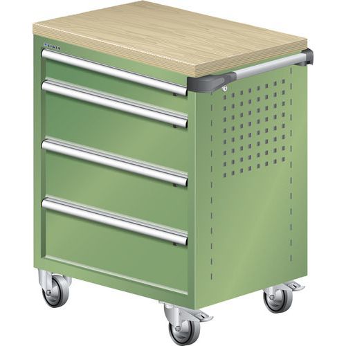 Dielenský zásuvkový vozík LISTA, pracovná doska z multiplexnej dyhy, 4 zásuvky, zelená