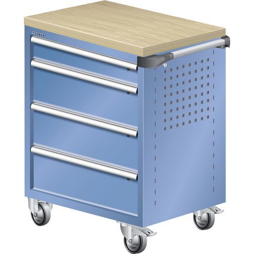 Dielenský zásuvkový vozík LISTA, pracovná doska z multiplexnej dyhy, 4 zásuvky, modrá