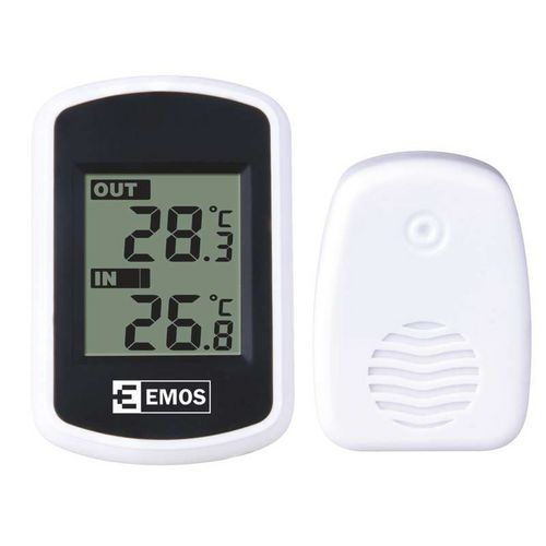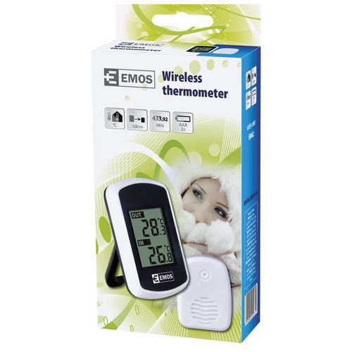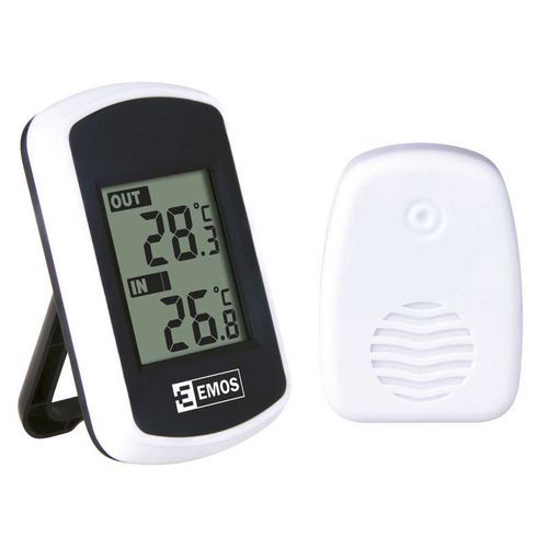 - Digitálny teplomer so zobrazením vnútornej a vonkajšej teploty pomocou bezdrôtového snímača s dosahom až 100 m vo voľnom priestore.