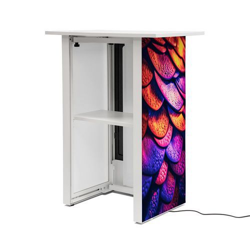 Digitálny Counter 32 posúva prezentáciu na vyššiu úroveň vďaka integrovanej 4K obrazovke. Rýchle zostavenie bez náradia a úložný priestor vo vnútri zaisťujú komfortné použitie. Možnosť personalizácie pomocou bočných SEG panelov zvýrazní branding. Skvelé riešenie pre výstavy, showroomy, obchodné centrá aj eventy.
