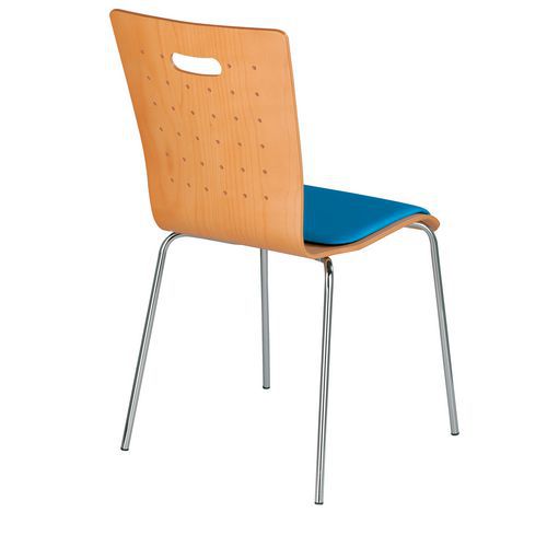 Tvarované škrupinové jedálenské stoličky v zaujímavom vyhotovení v kombinácii bukovej preglejky a čalúnenia. Farebné varianty zelenej, modrej a oranžovej zvýrazňujú elegantný vzhľad. Použitie transparentného laku garantuje dlhodobú ochranu materiálu. Stolička sa hodí do jedální i denných priestorov.
