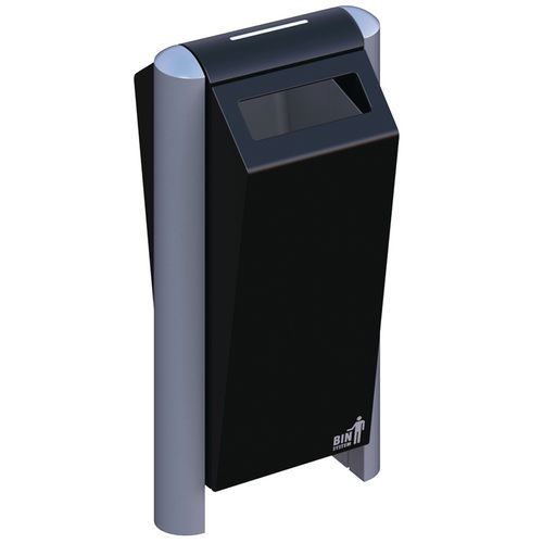 Krásne navrhnutý vonkajší odpadkový kôš z vysokokvalitnej práškovo lakovanej pozinkovanej ocele, s otvorom na odkladanie na oboch stranách.