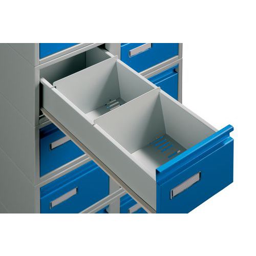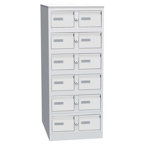 Dvojradová lístkovnica so soklom. Dvanásť zásuviek poskytuje dostatok úložného miesta na dokumenty vo formáte A6. Uzamykanie vždy dvoch susediacich zásuviek.