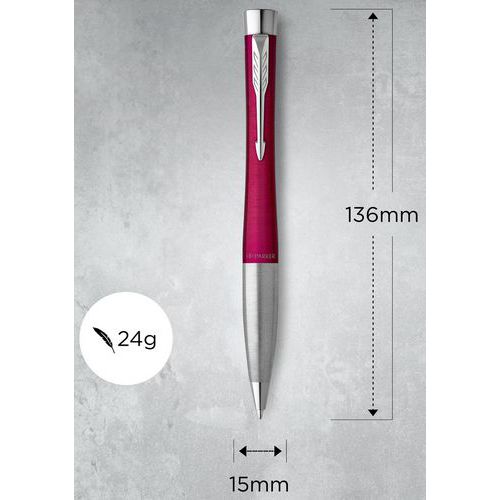 Guľôčkové pero Premium Urban Twist magenta, modrý atrament, dynamický design. Nadčasový, moderný a pútavý vzhľad. Vďaka zakrivenej siluete a vylepšenej hmotnosti ponúka toto pero dokonale vyvážené písanie, ktoré doplní váš štýl. Elegantný purpurový lak s chrómovaným lemovaním a chrómovaným telom. Atrament Quinkflow, fixovaný otočným mechanizmom, zaisťuje výnimočne hladké a spoľahlivé písanie. Zdokonalený otočný mechanizmus v spojení s atramentom Quinkflow zaisťuje hladké a konzistentné čiary na všetkých typoch papiera. Ergonomický tvar sa prispôsobí vášmu prirodzenému úchopu a hmotnosť pera zaručuje vyvážený zážitok z písania.