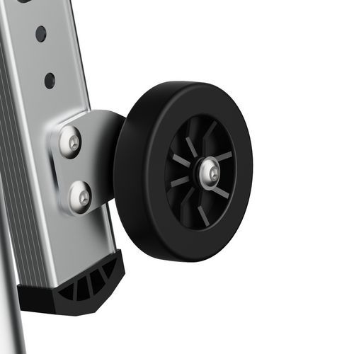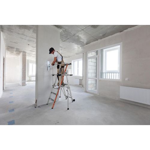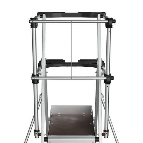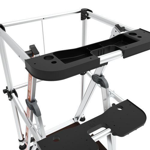 Duálne policové platformy Raptor. Pevné 4stranné zábradlie s ochrannými lištami proti pádu s poloautomatickým zatváraním. 80 mm protišmykové schodíky. Odnímateľný priehradkový držiak náradia s nosnosťou 25 kg, integrované háčiky s nosnosťou max. 10 kg. Protišmyková podlaha s rozmermi 500 x 400 mm z ekologického dreva. Ergonomický pracovný priestor. Výsuvné stabilizátory s milimetrovým nastavením.