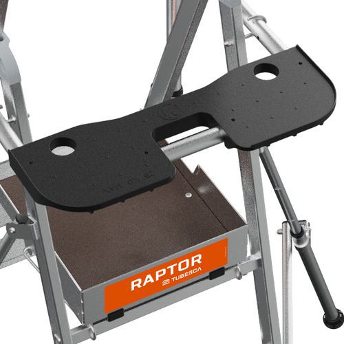 Duálne policové platformy Raptor. Pevné 4stranné zábradlie s ochrannými lištami proti pádu s poloautomatickým zatváraním. 80 mm protišmykové schodíky. Odnímateľný priehradkový držiak náradia s nosnosťou 25 kg, integrované háčiky s nosnosťou max. 10 kg. Protišmyková podlaha s rozmermi 500 x 400 mm z ekologického dreva. Ergonomický pracovný priestor. Výsuvné stabilizátory s milimetrovým nastavením. Max. zaťaženie (kg) : 150