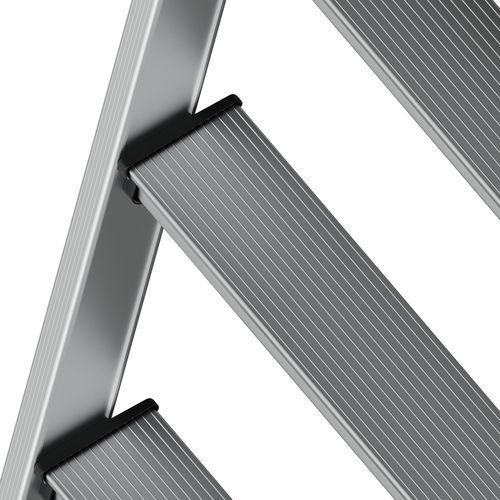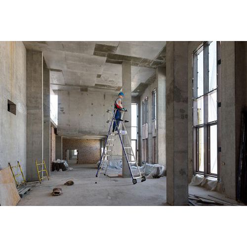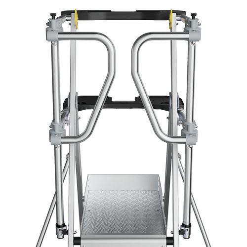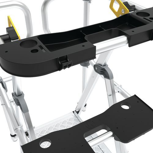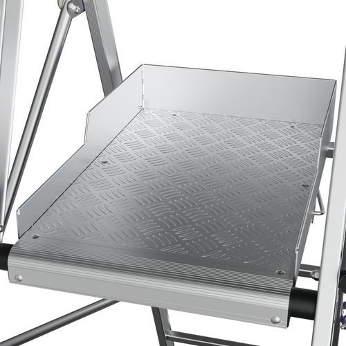 Platformy Sherpamatic Saloon. Pevné 4stranné zábradlie s automatickým zatváraním brány typu Saloon. Protišmykové schodíky 80 mm. Odnímateľný priehradkový držiak náradia - nosnosť 25 kg, s integrovanými háčikmi (max. 10 kg). Výsuvné stabilizátory komfortná podlaha 590 x 400 mm z protišmykového hliníka. Pohodlný a ergonomický pracovný priestor. Platforma sa počíta ako jeden krok. Max. zaťaženie (kg) : 150