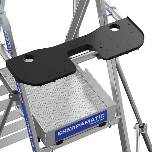 Platformy Sherpamatic Saloon. Pevné 4stranné zábradlie s automatickým zatváraním brány typu Saloon. Protišmykové schodíky 80 mm. Odnímateľný priehradkový držiak náradia - nosnosť 25 kg, s integrovanými háčikmi (max. 10 kg). Výsuvné stabilizátory komfortná podlaha 590 x 400 mm z protišmykového hliníka. Pohodlný a ergonomický pracovný priestor. Platforma sa počíta ako jeden krok.