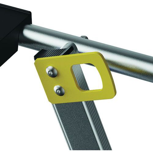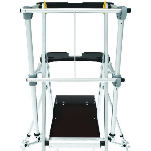 Pracovné plošiny Sherpamatic. Pevné 4stranné zábradlie s poloautomatickým zatváraním zadných zábradlí proti pádu. Protišmykové schodíky 80 mm. Odnímateľný priehradkový držiak náradia s nosnosťou 25 kg, s integrovanými háčikmi (max. 10 kg). Výsuv. Vysoko komfortná protišmyková podlaha 590 x 400 mm. Ergonomický a pohodlný pracovný priestor. Terénne pojazdové kolesá Ø175 mm. Max. zaťaženie (kg) : 150 kg