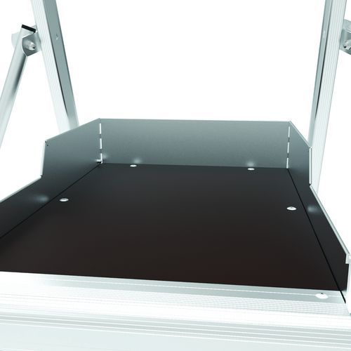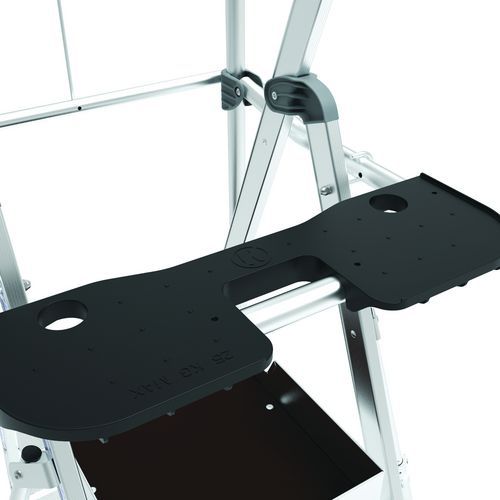 Pracovné plošiny Sherpamatic. Pevné 4stranné zábradlie s poloautomatickým zatváraním zadných zábradlí proti pádu. Protišmykové schodíky 80 mm. Odnímateľný priehradkový držiak náradia s nosnosťou 25 kg, s integrovanými háčikmi (max. 10 kg). Výsuv. Vysoko komfortná protišmyková podlaha 590 x 400 mm. Ergonomický a pohodlný pracovný priestor. Terénne pojazdové kolesá Ø175 mm.