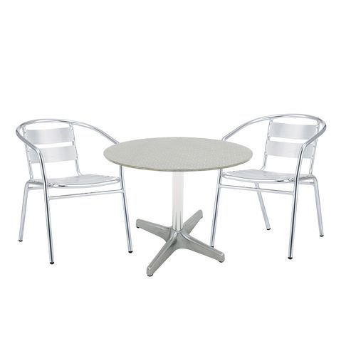 - Súprava dvoch stoličiek a okrúhleho stola vyrobená z hliníka. Túto jedálenskú súpravu môžete využívať tak v interiéri, ako aj v exteriéri.