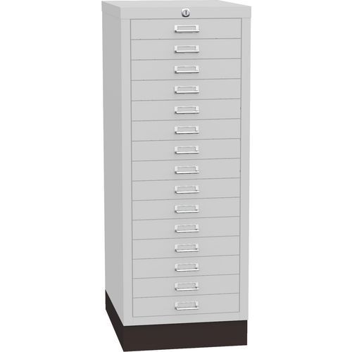 - Kovová kartotéka s pätnástimi zásuvkami a soklom. Centrálny zámok zásuviek.