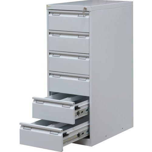 - Kovové kartotéky so šiestimi zásuvkami. Pevná oceľová konštrukcia, blokácia zásuviek.