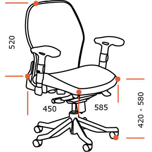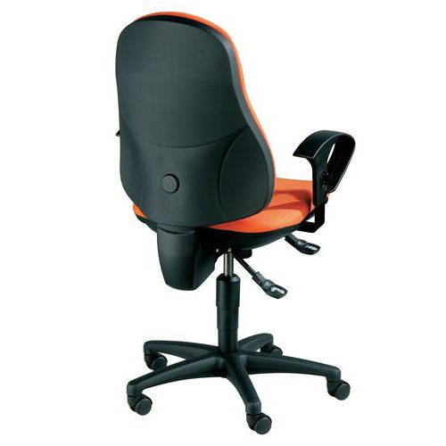 Čalúnené kancelárske kreslo s tvarovaným operadlom a integrovanou oporou bedrovej chrbtice s možnosťou nastavenia výšky pomocou západkového mechanizmu. Výhodu predstavuje pohodlné, ergonomicky tvarované sedadlo a synchrónny chrbtový mechanizmus umožňujúci plynulé nastavenie vzájomnej polohy sedadla a operadla vrátane výšky sedadla. Možnosť nastaviť protitlak operadla podľa hmotnosti sediacej osoby. Otočné stoličky sú opatrené dvojitými bezpečnostnými kolieskami na mäkké povrchy brzdenými v závislosti od zaťaženia. K dispozícii v troch farebných variantoch. Nosnosť tejto otočnej stoličky je 120 kg.