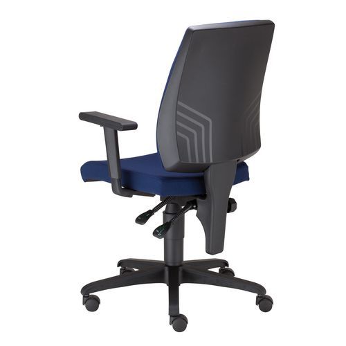 Čalúnené kancelárske stoličky s ergonomicky tvarovaným operadlom, trvalým kontaktom a nastaviteľným sklonom a výškou operadla.