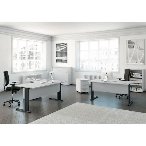 - Písacie stoly Manutan Expert s doskou z melamínového panelu v šedom prevedení s hrúbkou 25 mm.