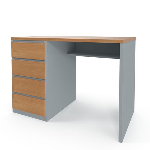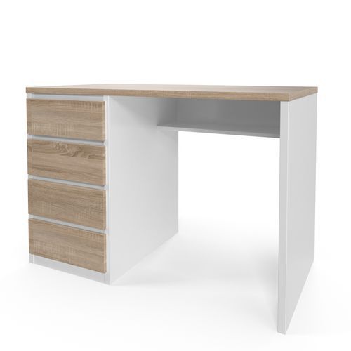 Malé stoly vhodné vďaka svojim rozmerom na prácu na home office alebo do malej kancelárie. Štyri plne výsuvné zásuvky v ľavej časti stola. Pracovná doska a nohy stola sú vyrobené z drevotriesky hr. 25 mm, ostatné časti sú vyrobené z drevotriesky hr. 18 mm. Pracovná doska je vybavená 2mm ABS hranou. Plastové klzáky na nohách stola. Dodáva sa vo vyhotovení buk/sivá, dub sonoma/biela alebo dub oyster/biela.