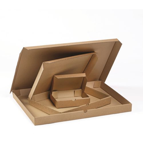 Pevné prepravné krabice z kraftového kartónu farby Havana. Konštrukcia špeciálne prispôsobená plochým formátom. Druh lepenky : Trojvrstvová