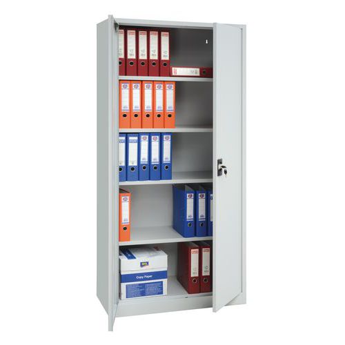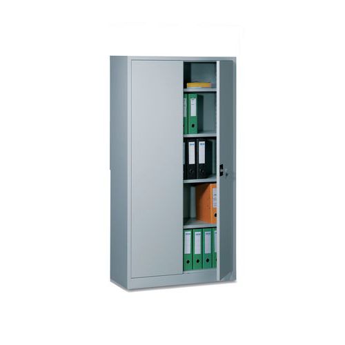 - Zváraná skriňa na spisy, šanóny alebo závesné obaly A4. Výškovo prestaviteľné police. Vystužené krídlové dvere s plastovými dorazmi, cylindrický bezpečnostný zámok Ronis, dva kľúče.