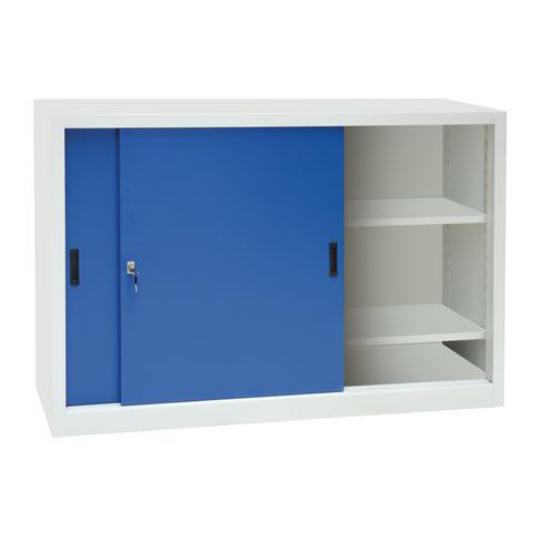 - Nízke kovové skrine s dvoma výškovo nastaviteľnými policami a posuvnými dverami. Konštrukcia je zváraná z oceľového plechu. Skrine je možné uzamknúť cylindrickým zámkom.