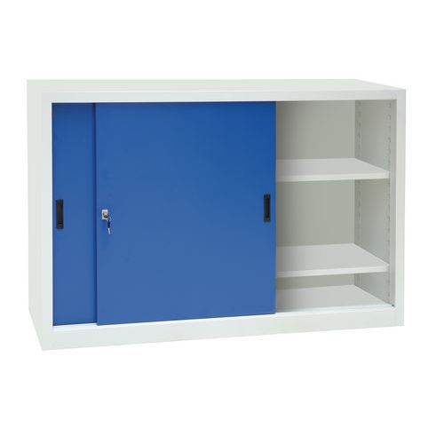 - Nízke kovové skrine s dvoma výškovo nastaviteľnými policami a posuvnými dverami. Konštrukcia je zváraná z oceľového plechu. Skrine je možné uzamknúť cylindrickým zámkom.