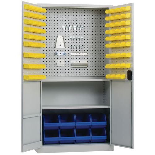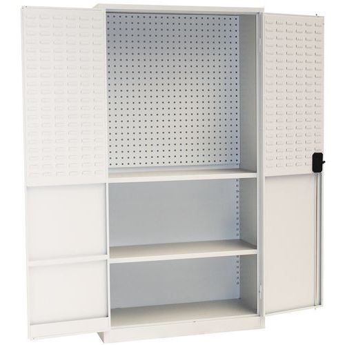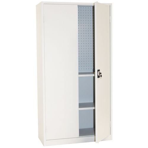 Dielenské skrine s dvoma policami sú vyrobené z oceľového plechu. Zadná časť kovových skríň aj dvere sú vybavené perforovanými panelmi na prichytenie držiakov náradia a boxov (72 + 8 ks). Plechové skrine je možné uzamknúť cylindrickou dvojbodovou rázvorovou zámkou. Uhol otvorenia dverí je 180°. Police sú nastaviteľné v rozstupe 3,6 cm. Vyrobené z plechu hr. 0,9 mm.