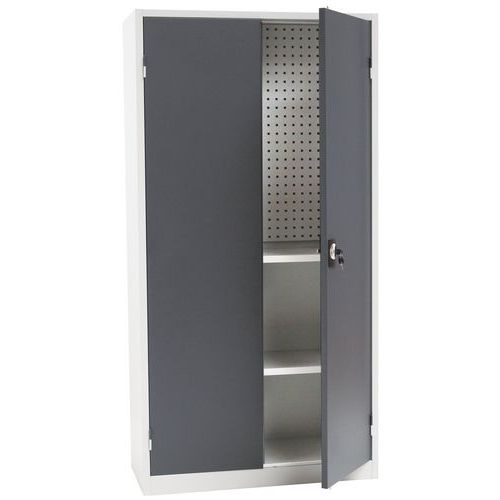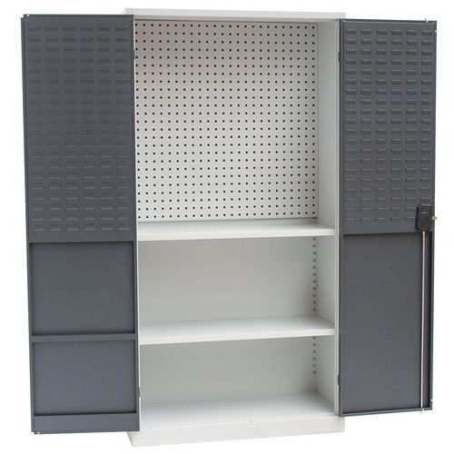 Dielenské skrine s dvoma policami sú vyrobené z oceľového plechu. Zadná časť kovových skríň aj dvere sú vybavené perforovanými panelmi na prichytenie držiakov náradia a boxov (72 + 8 ks). Plechové skrine je možné uzamknúť cylindrickou dvojbodovou rázvorovou zámkou. Uhol otvorenia dverí je 180°. Police sú nastaviteľné v rozstupe 3,6 cm. Vyrobené z plechu hr. 0,9 mm. Záruka výrobcu pre zákazníka : 10 rokov