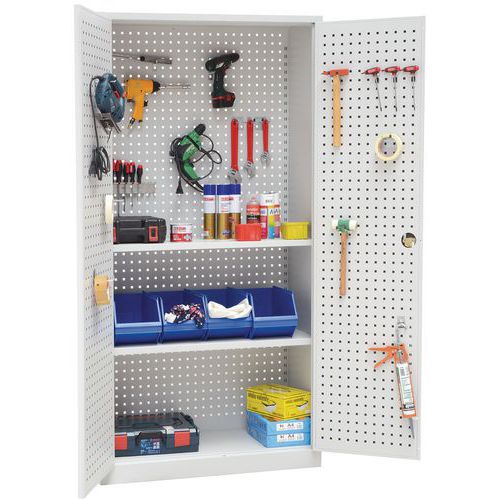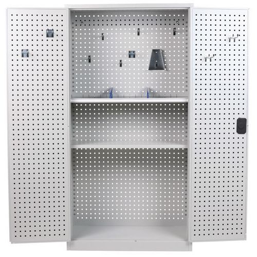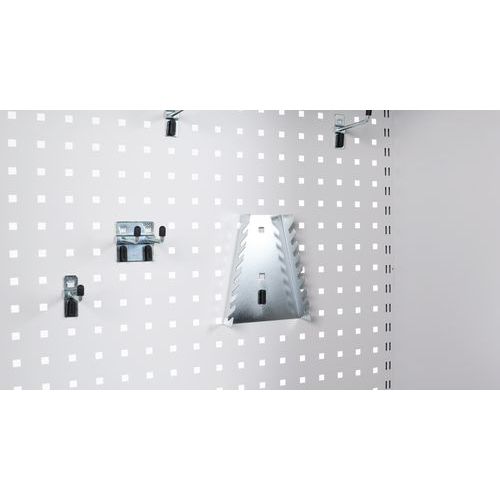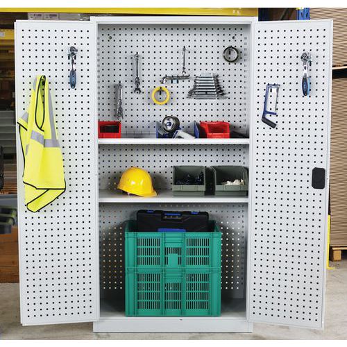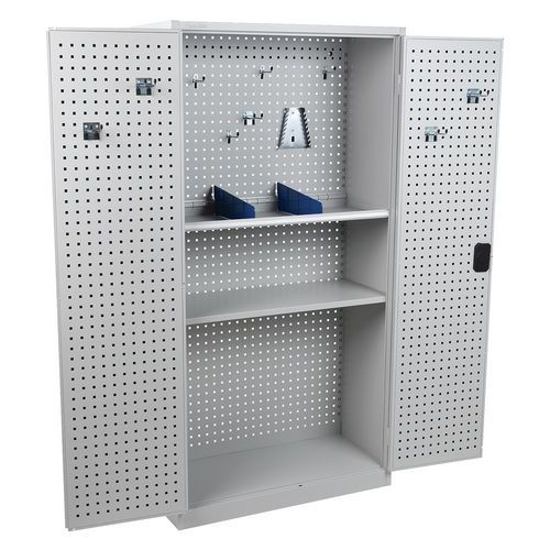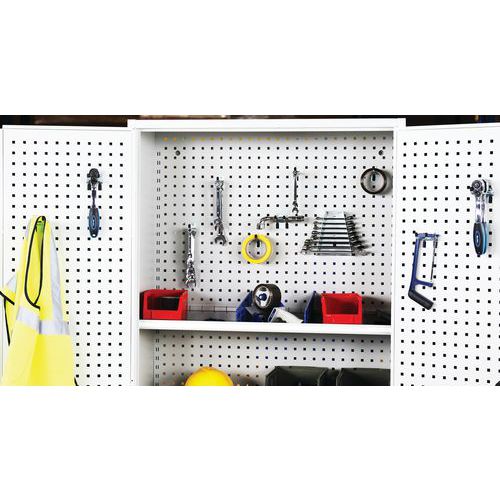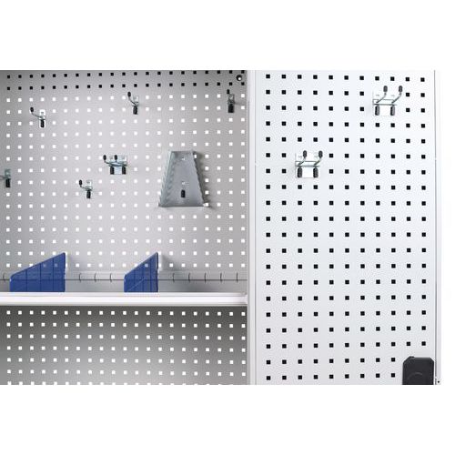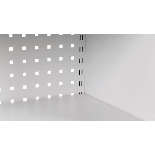 - Zadná časť kovových skríň aj dvere sú vybavené perforovanými panelmi na prichytenie držiakov náradia a boxov.