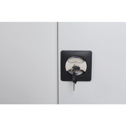 - Plechové skrine je možné uzamknúť cylindrickou dvojbodovou rázvorovou zámkou.