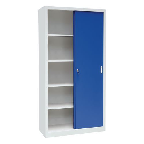 - Vysoké kovové skrine so štyrmi výškovo nastaviteľnými policami a posuvnými dverami. Konštrukcia je zváraná z oceľového plechu. Skrine je možné uzamknúť cylindrickým zámkom.