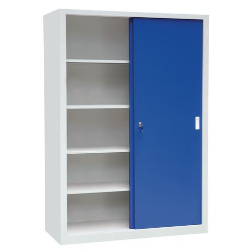 - Vysoké kovové skrine so štyrmi výškovo nastaviteľnými policami a posuvnými dverami. Konštrukcia je zváraná z oceľového plechu. Skrine je možné uzamknúť cylindrickým zámkom.