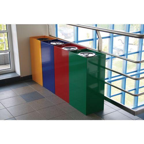 Kovové odpadkové koše na triedený odpad. Voľne odnímateľné veko s príchytkami a kruhovým otvorom, modrý kôš na papier má navyše pozdĺžny otvor. Vhodné na triedenie v školách, administratívnych budovách a úradoch.