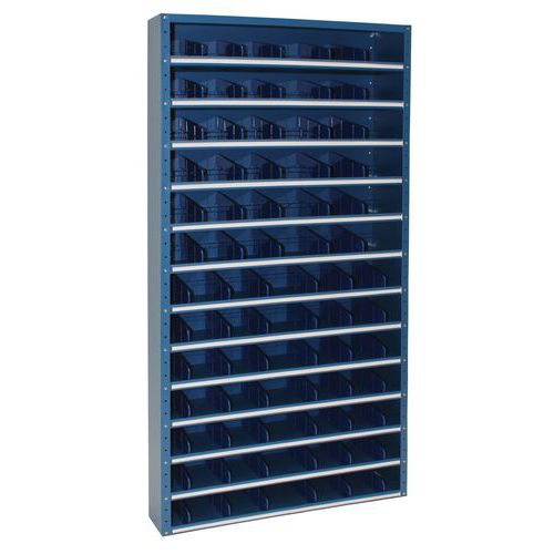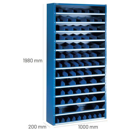 Kovový regál s deliacimi priehradkami Manutan Expert, 198 x 100 x 20 cm, 12 políc, modrý