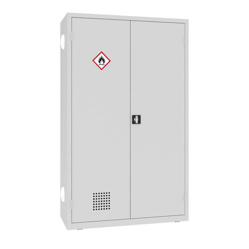 - Krídlové dvere majú vetracie otvory na cirkuláciu vzduchu a sú opatrené štítkom GHS-02 pre štandardnú identifikáciu chemického nebezpečenstva.