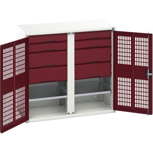 Kovová skriňa na údržbu Bott Verso, drôtené dvere, 100 x 105 x 55 cm, 2 police, 8 zásuviek, šedá-červená