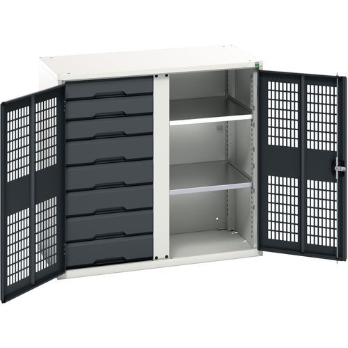 Kovová skriňa na údržbu Bott Verso, drôtené dvere, 100 x 105 x 55 cm, 2 police, 8 zásuviek, šedá-antracit