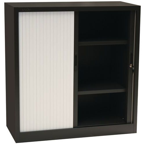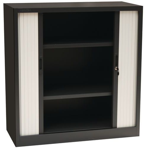 Skrine s dvoma nastaviteľnými policami a plastovými roletami, ktoré je možné plne zasunúť do strán.