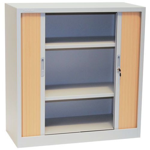 Skrine s dvoma nastaviteľnými policami a plastovými roletami, ktoré je možné plne zasunúť do strán.