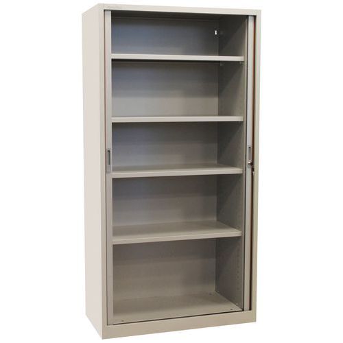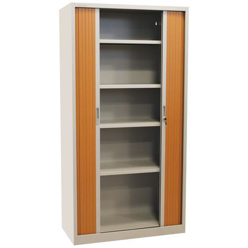 Skrine so štyrmi nastaviteľnými policami a plastovými roletami, ktoré je možné plne zasunúť do strán.