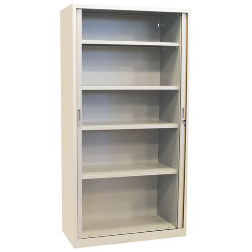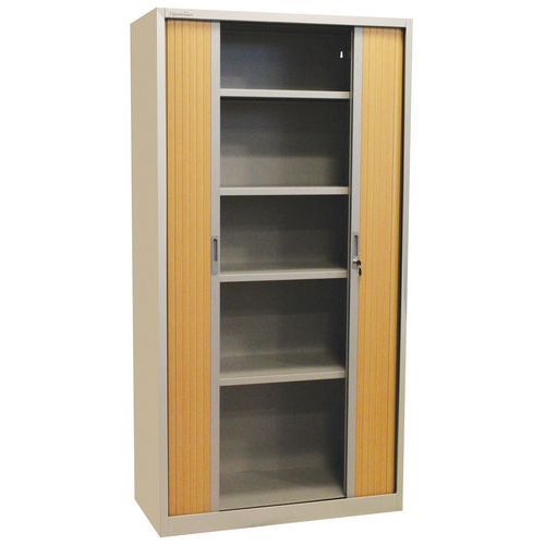 Skrine so štyrmi nastaviteľnými policami a plastovými roletami, ktoré je možné plne zasunúť do strán.