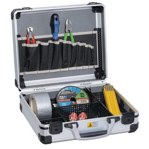 - Odolný plastový kufor s hliníkovým rámom. Vhodný najmä na náradie a montážny materiál. Variabilné plastové priehradky a textilné vrecká v hornom veku kufra. Uzatvárateľný pomocou kovových klíps.