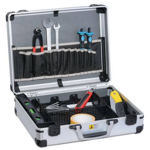 - Odolný plastový kufor s hliníkovým rámom. Vhodný najmä na náradie a montážny materiál. Variabilné plastové priehradky a textilné vrecká v hornom veku kufra. Uzatvárateľný pomocou kovových klíps.