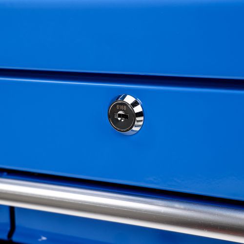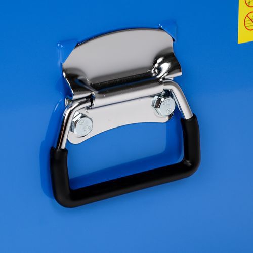 - Kovový kufor so šiestimi zásuvkami a polstrovanými držadlami na každej strane.