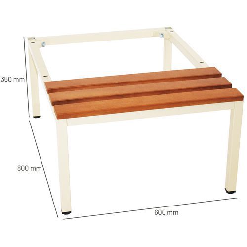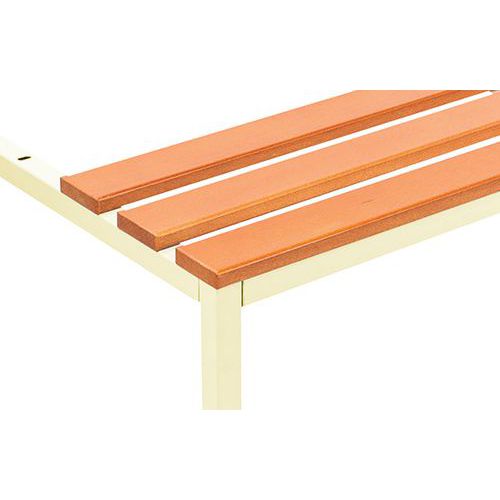 - Lavica z oceľovej konštrukcie a drevenou sedacou plochou pre umiestnenie pod kovové šatňové skrine.