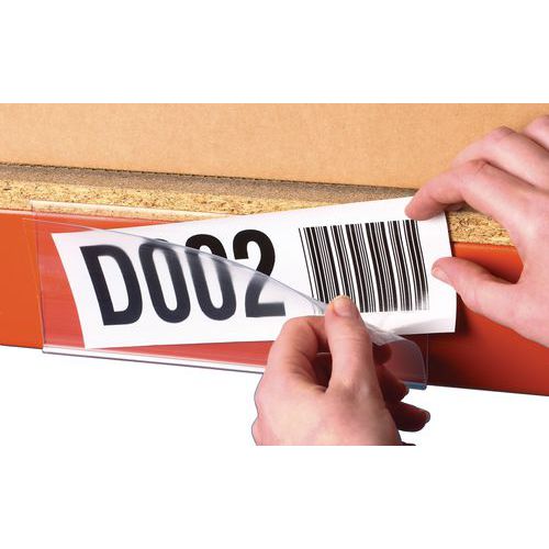 Samolepiace držiaky etikiet sa dodávajú spoločne s priehľadným štítkom so samolepiacou zadnou stranou a bielou vkladacou kartičkou. Držiaky na štítky slúžia na rýchlu a jednoduchú orientáciu v uličkách a poličkách regálov. Čítanie bar kódov je možné bez vytiahnutia štítka. typ upevnenia: samolepiace materiál: polyvinylchlorid farba: priehľadná balenie: 10 – 100 ks etikety a priehľadný štítok súčasťou balenia