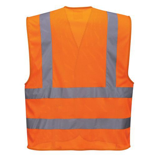 Táto sieťovinová vesta plne spĺňa štandard podľa EN ISO 20471. Perfektná do horúceho počasia. CE certifikované Reflexná páska Zapínanie na suchý zips 5XL Veľkorysý na nosenie Chladiaca pletivová tkanina Vyhovuje RIS 3279-TOM pre železničný priemysel Certifikované po 50 pracích cykloch